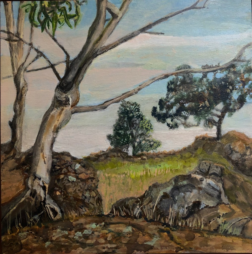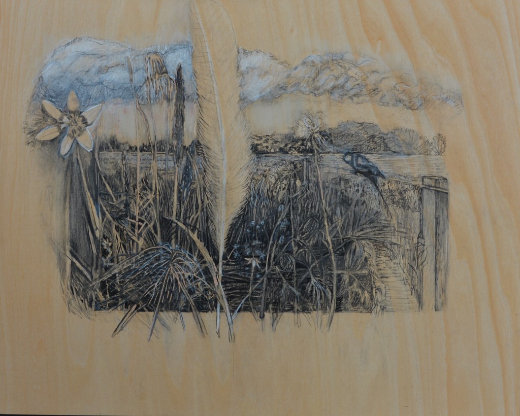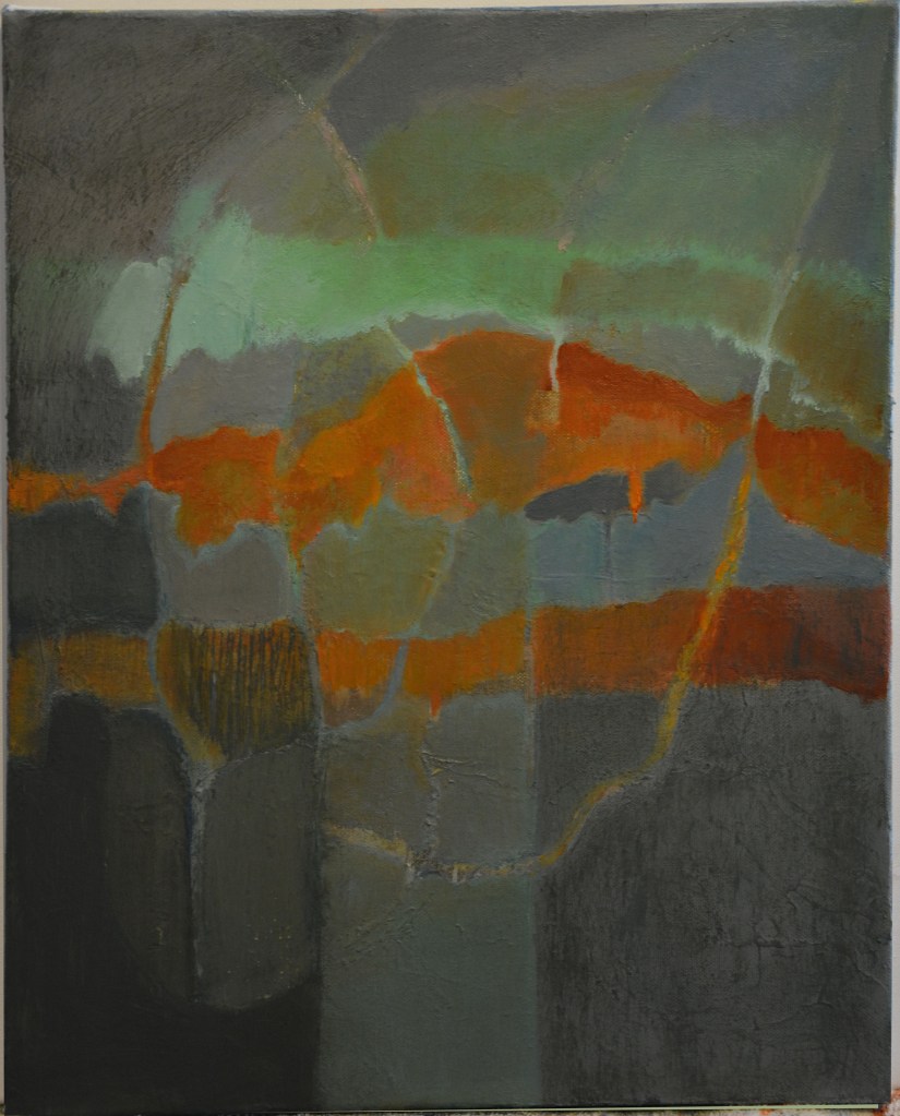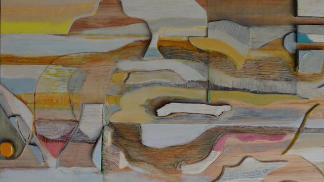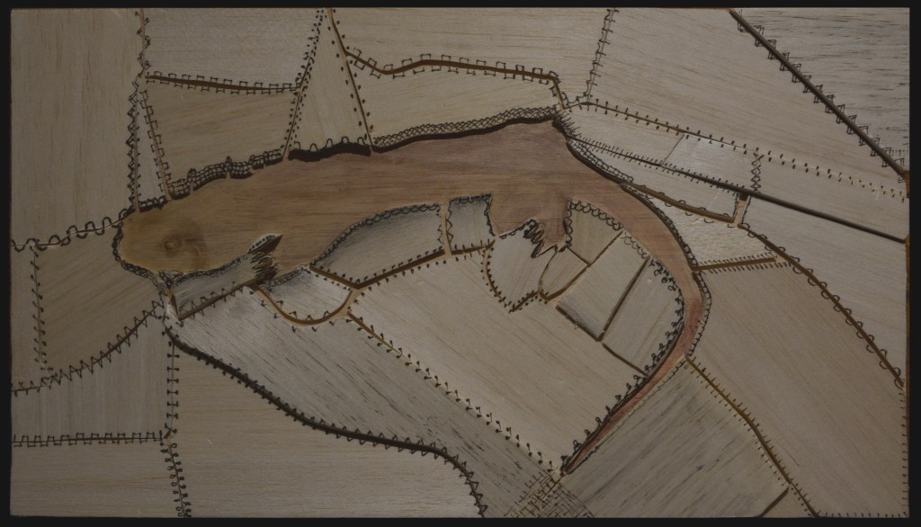 balsa wood collage with pyrography, abstract oils on linen and canvas