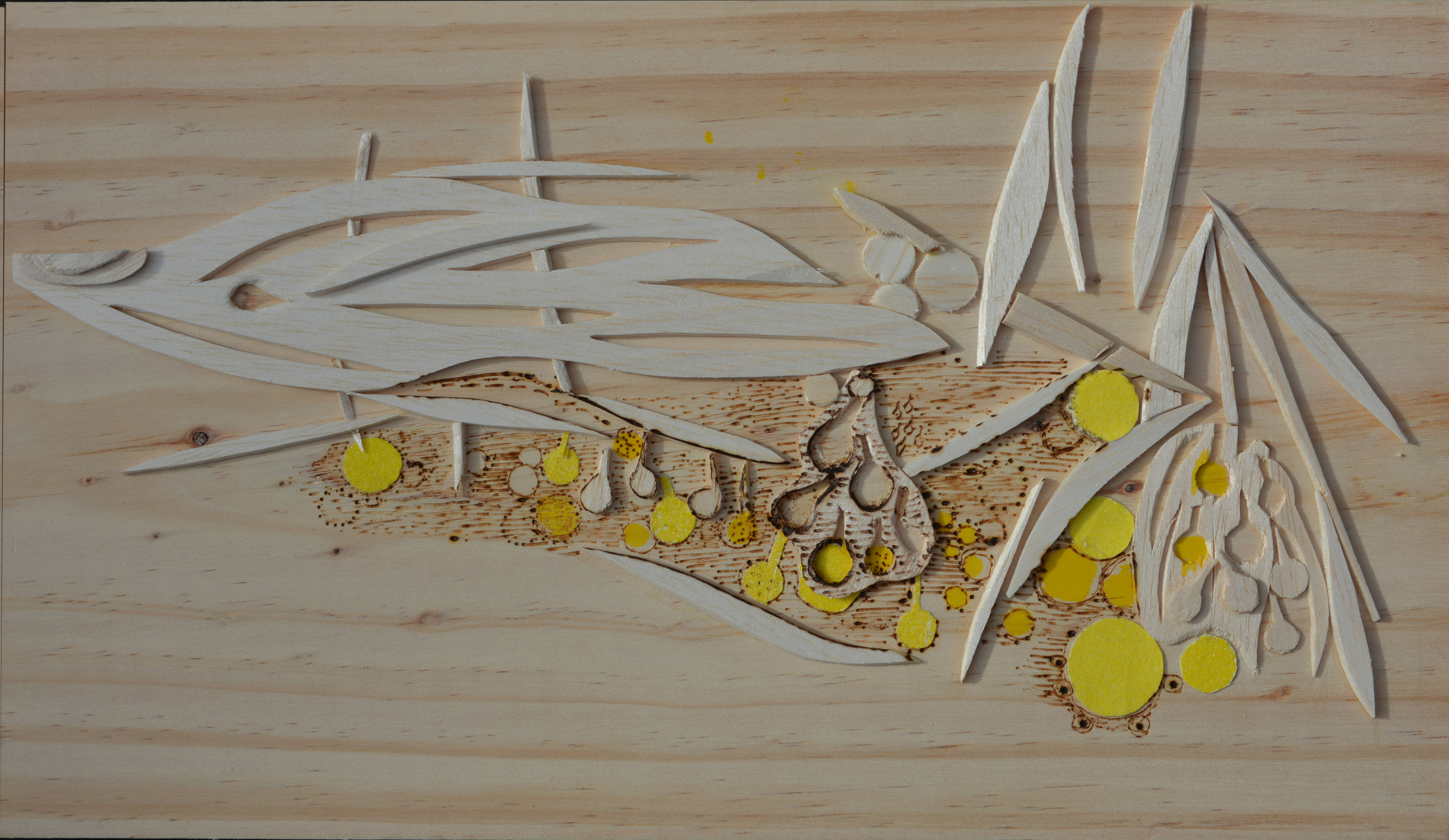 Griffin, F. Wattle 2, 32 x 50cm November 8, 2017January 29, 2020 | FG 32 x 50cm (framed) balsa and sandpaper collage with pyrography on wood