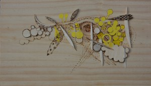 Griffin, F. Wattle 3, 32 x 50cm November 8, 2017January 29, 2020 | FG balsa and sandpaper collage with pyrography on pine 32cm x 50 cm framed